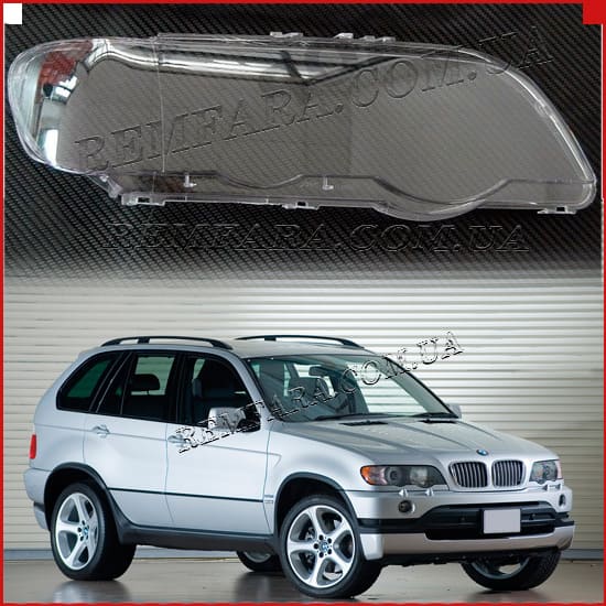 Скло фари до Скло фари BMW X5 E53 1999-2003. Дорестайлінг праве, виготовлене з оптичного полікарбонату, є замінним елементом, призначеним для відновлення частини світлового обладнання автомобіля. Воно пропонується як альтернатива повній заміні фари, дозволяючи оновити лише скляну частину.
